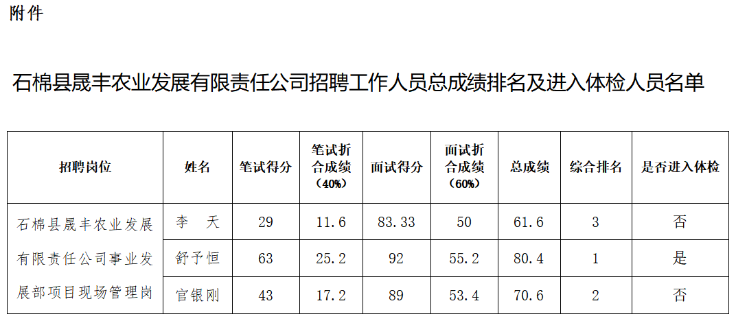 石棉县蓝狮在线农业发展有限责任公司招聘事业发展部工作人员笔试、面试工作已结束,根据《石棉县蓝狮在线农业发展有限责任公司招聘工作人员公告》规定,现将总成绩排名及进入体检人员名单予以公告,并将体检有关事宜公告如下。