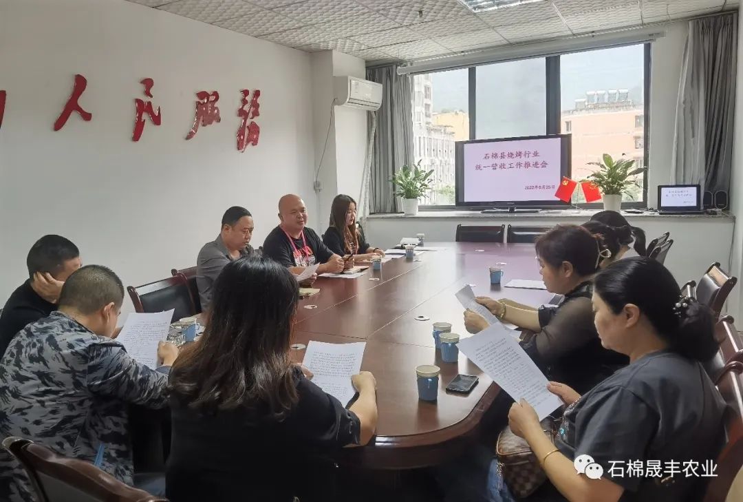 2.5月25日下午,为规范化开展烧烤行业经营,逐步实现烧烤行业统一收银,丰味餐饮公司总经理唐博带队在市场监管局与石棉烧烤商户代表进行了座谈,会议就今后烧烤行业形象联盟组建、统一营收、合作运营、扩大经营半径等方面进行讨论。