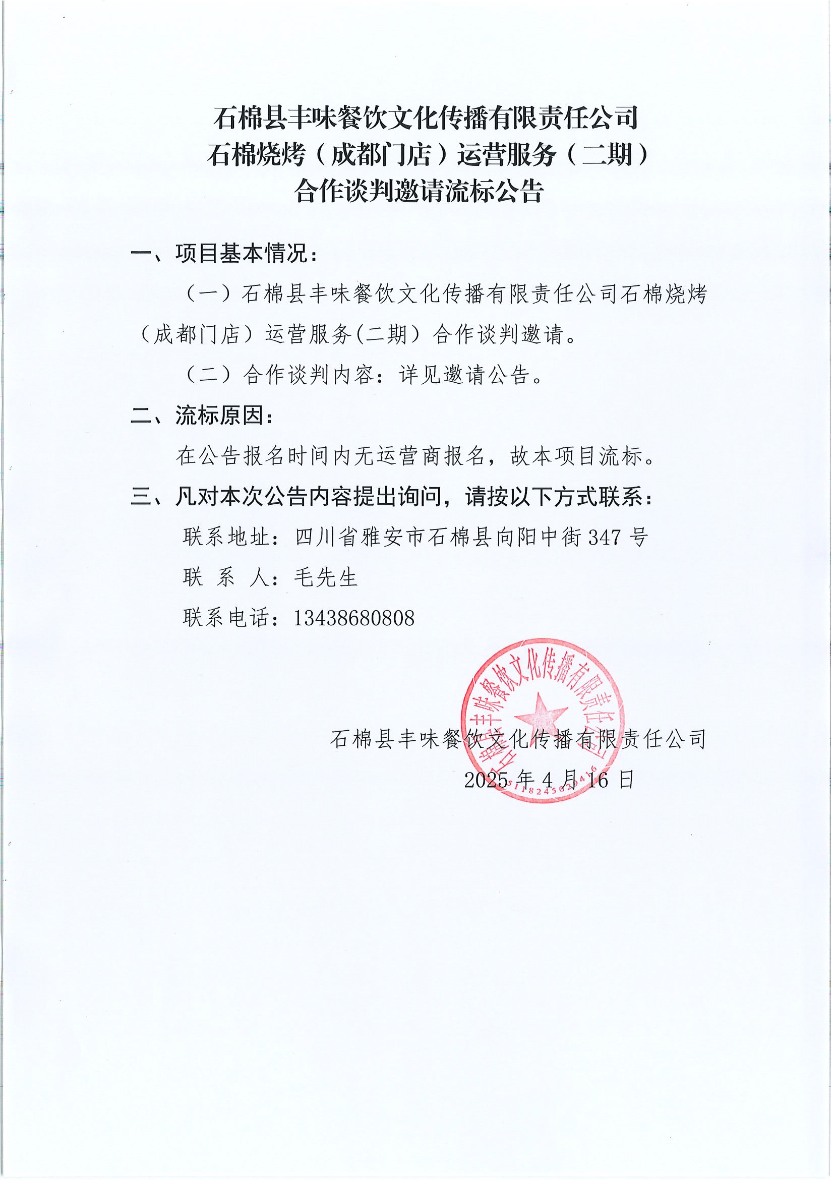 石棉县丰味餐饮文化传播有限责任公司石棉烧烤(成都门店)运营服务(二期)合作谈判邀请流标公告